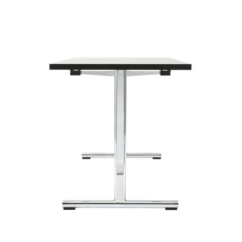 T-foot frame foldable, consisting of oval tube column 60 x 30 x 1.5 mm with polished chromed tubular pipe skid Ø 40 x 2 mm, pipe ends soldered. Upper crosspiece polished chromed steel 5 x 27 mm. Table side stored with two-part special hinges. The folding mechanism is completely screwed to the table top by threaded sleeves. Locking occurs in a metal guide. It is triggered by means of a spring-mounted knob. The hinge heads are designed as stacking protectors.
